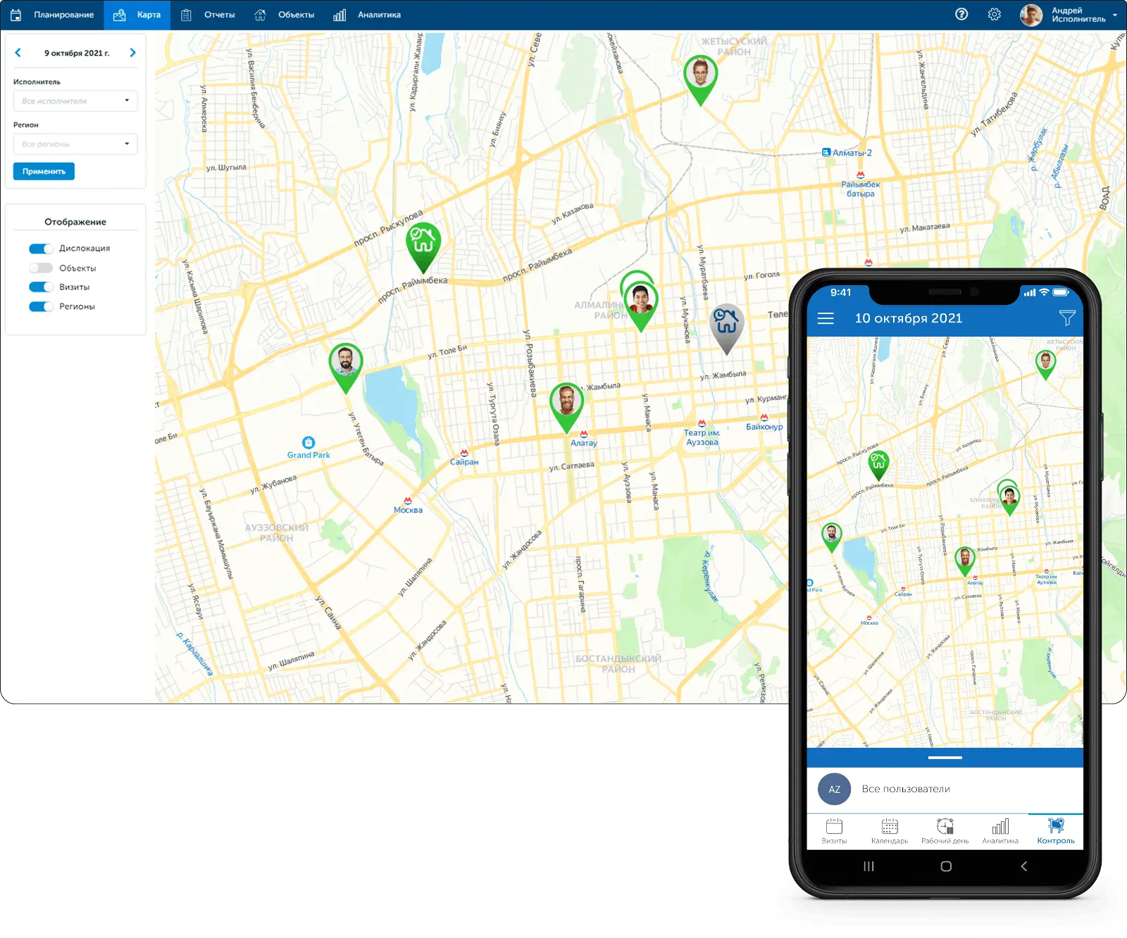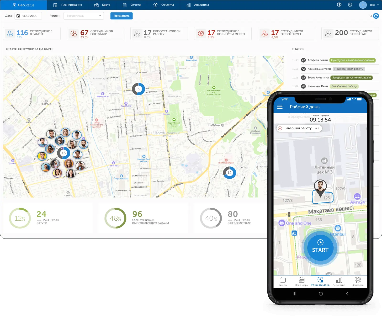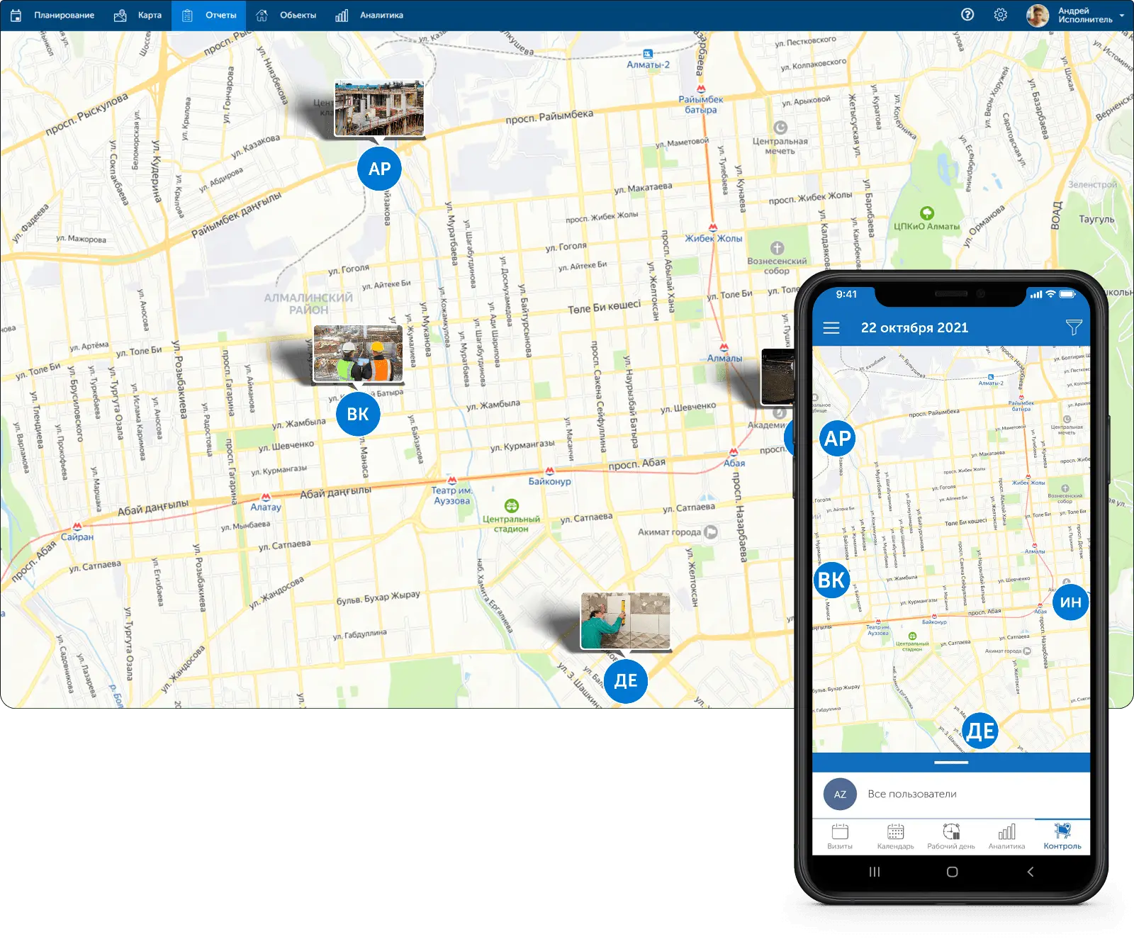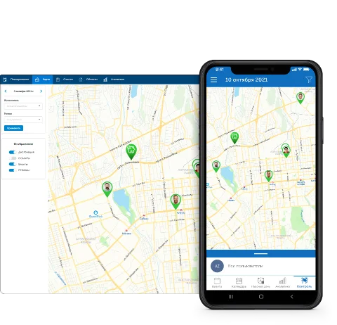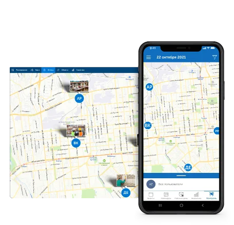Просмотр местоположения сотрудников и статусов работ на карте в реальном времени.