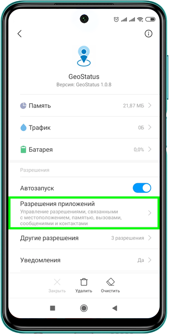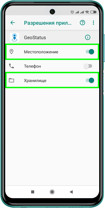 Откройте: Настройки → Все приложения → GeoStatus → Разрешения приложений → Местоположение и Память → Передвиньте переключатели вправо.