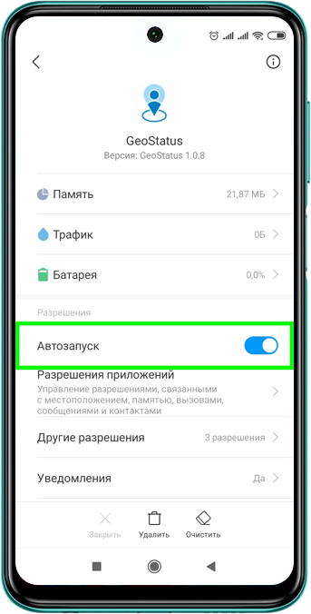 Откройте: Настройки → Все приложения → GeoStatus → Автозапуск → Передвиньте переключатель вправо.